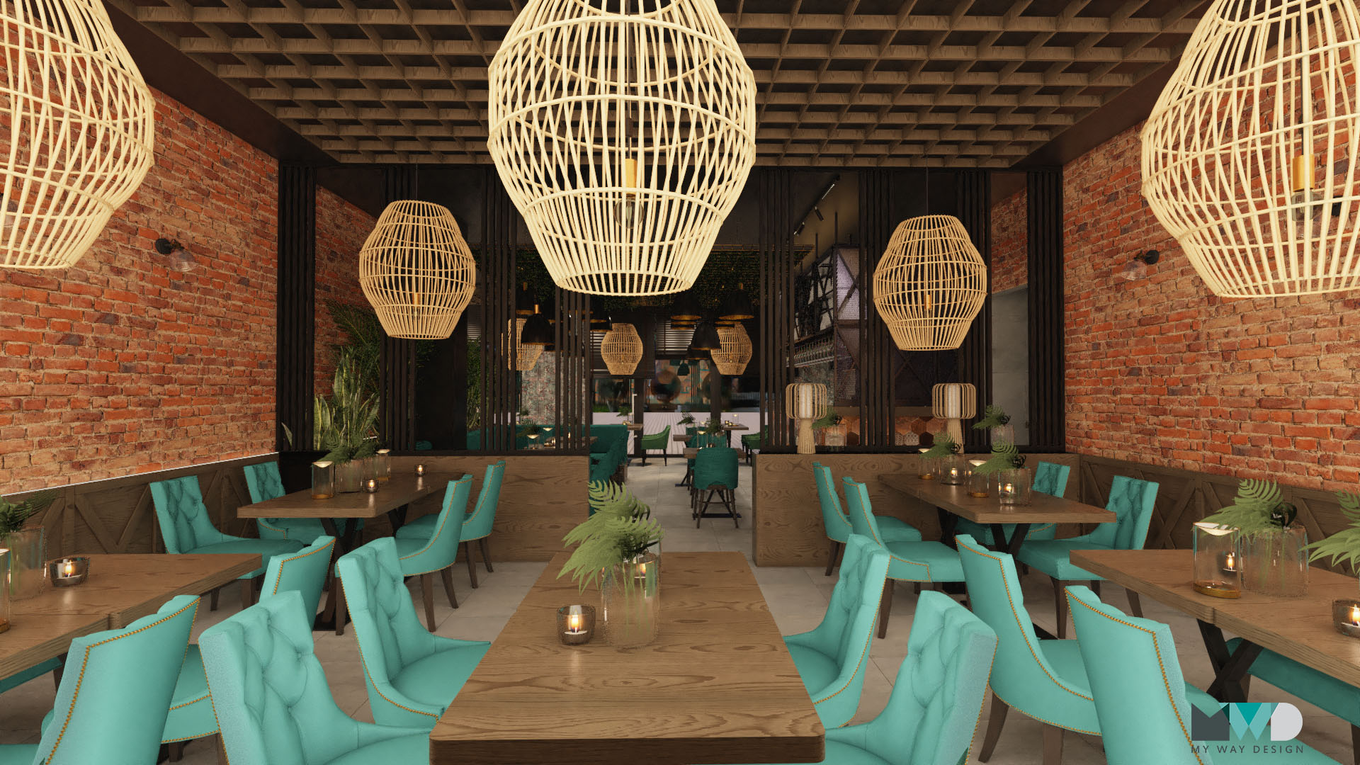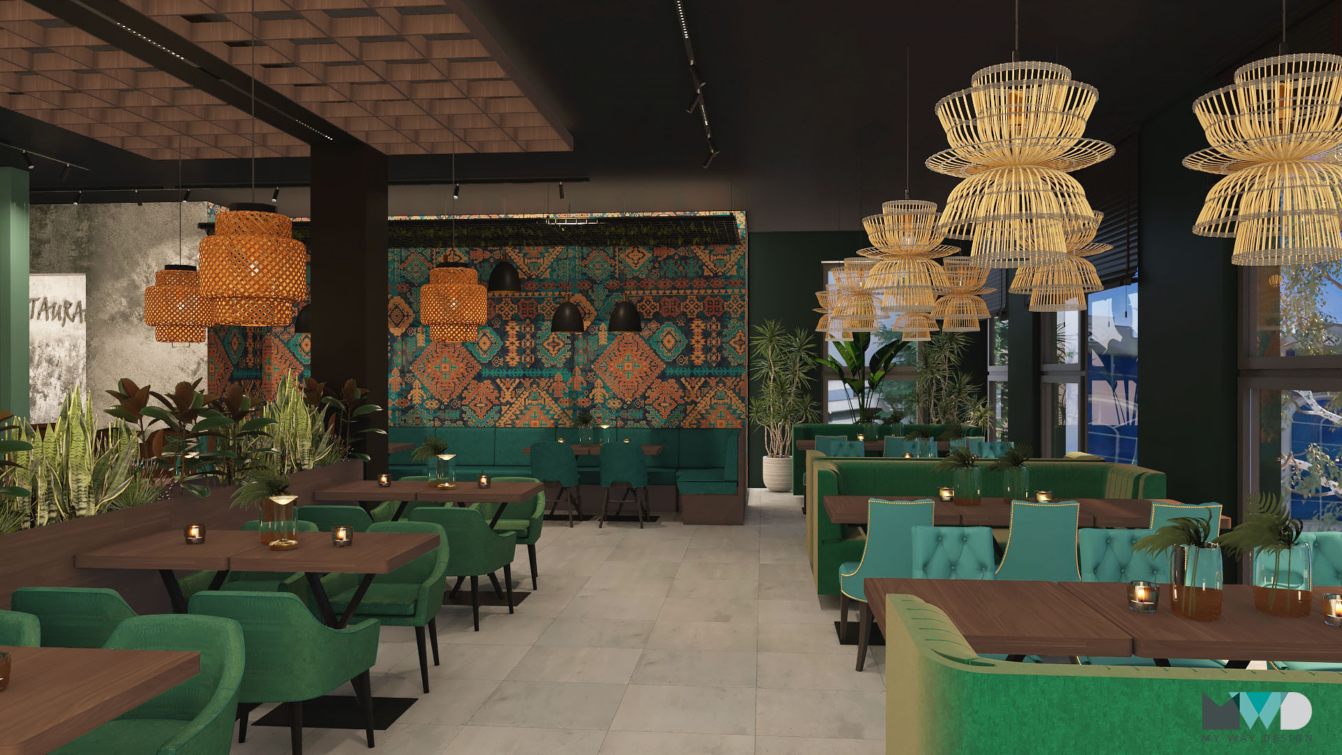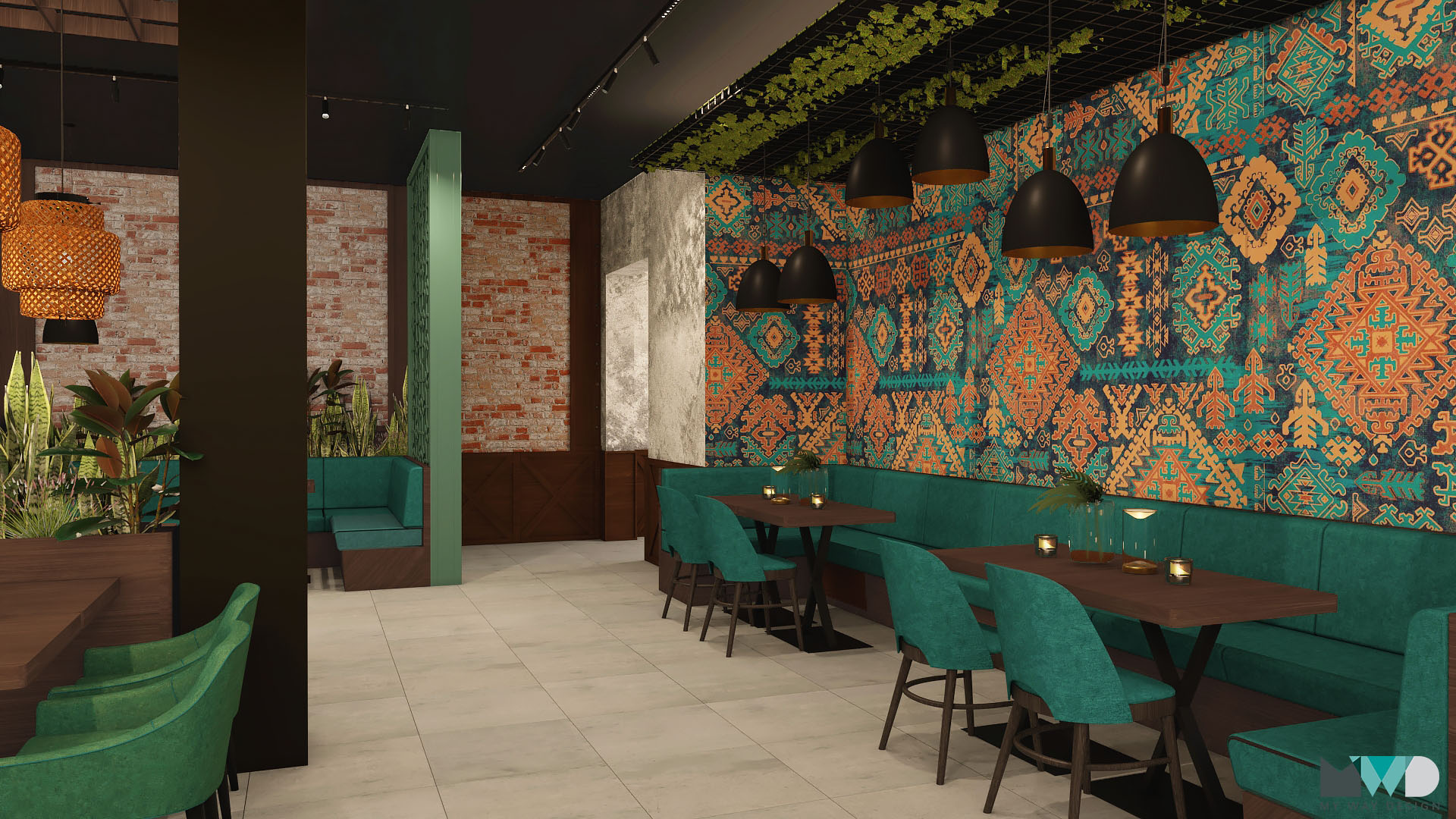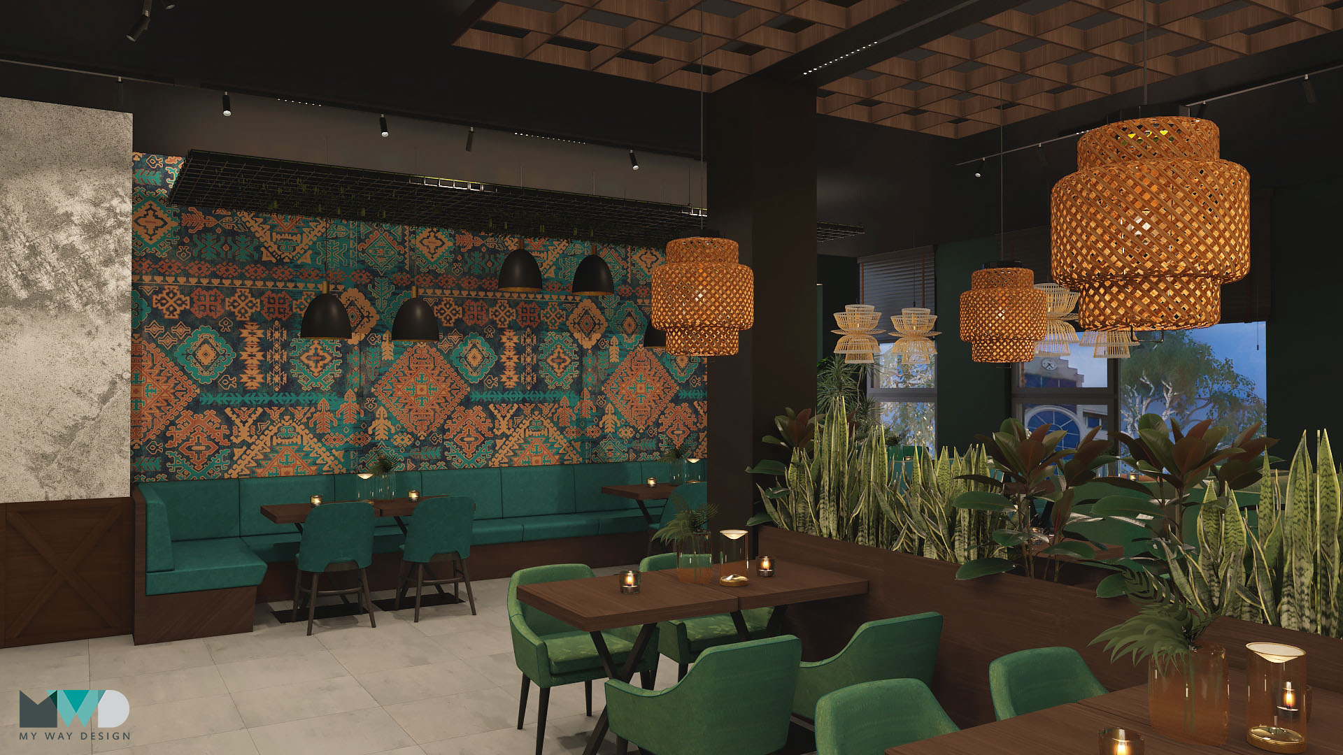 Wnętrze restauracji to prawdziwa gratka dla miłośników orientu. Ściany zdobią fototapety z orientalnymi wzorami, które przenoszą gości w klimat bliskowschodnich bazarów. Metalowe lampy, wiszące nad stołami, dodają wnętrzu klimatu, przypominając tureckie kawiarnie. Zieleń odgrywa tu kluczową rolę – liczne rośliny, starannie wkomponowane w drewniane osłony, ożywiają przestrzeń i wprowadzają atmosferę relaksu.