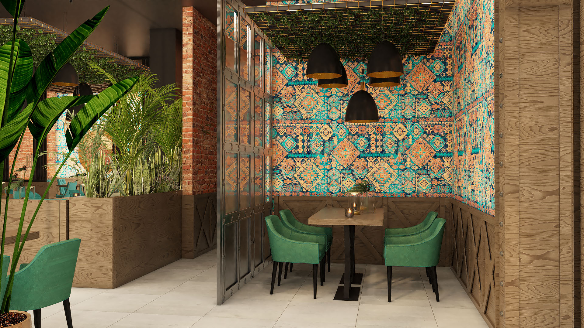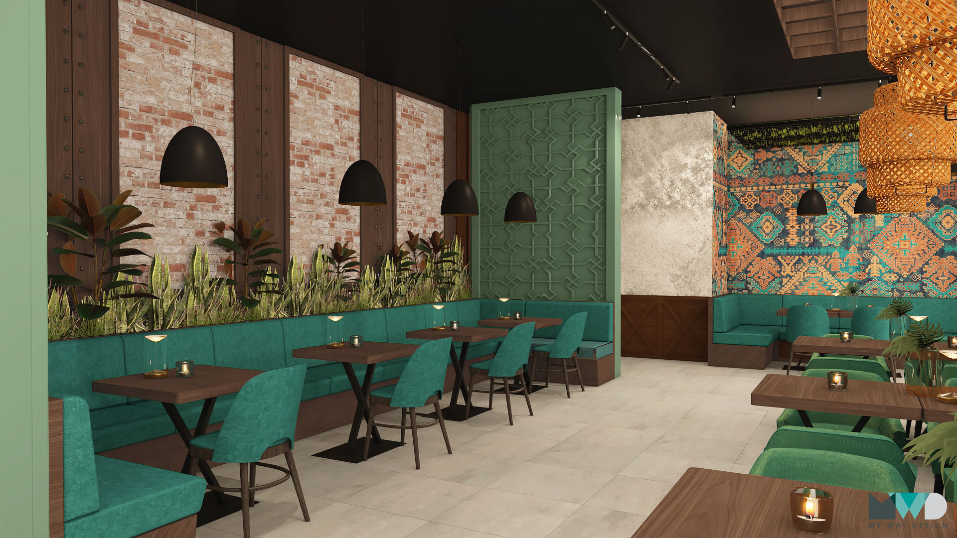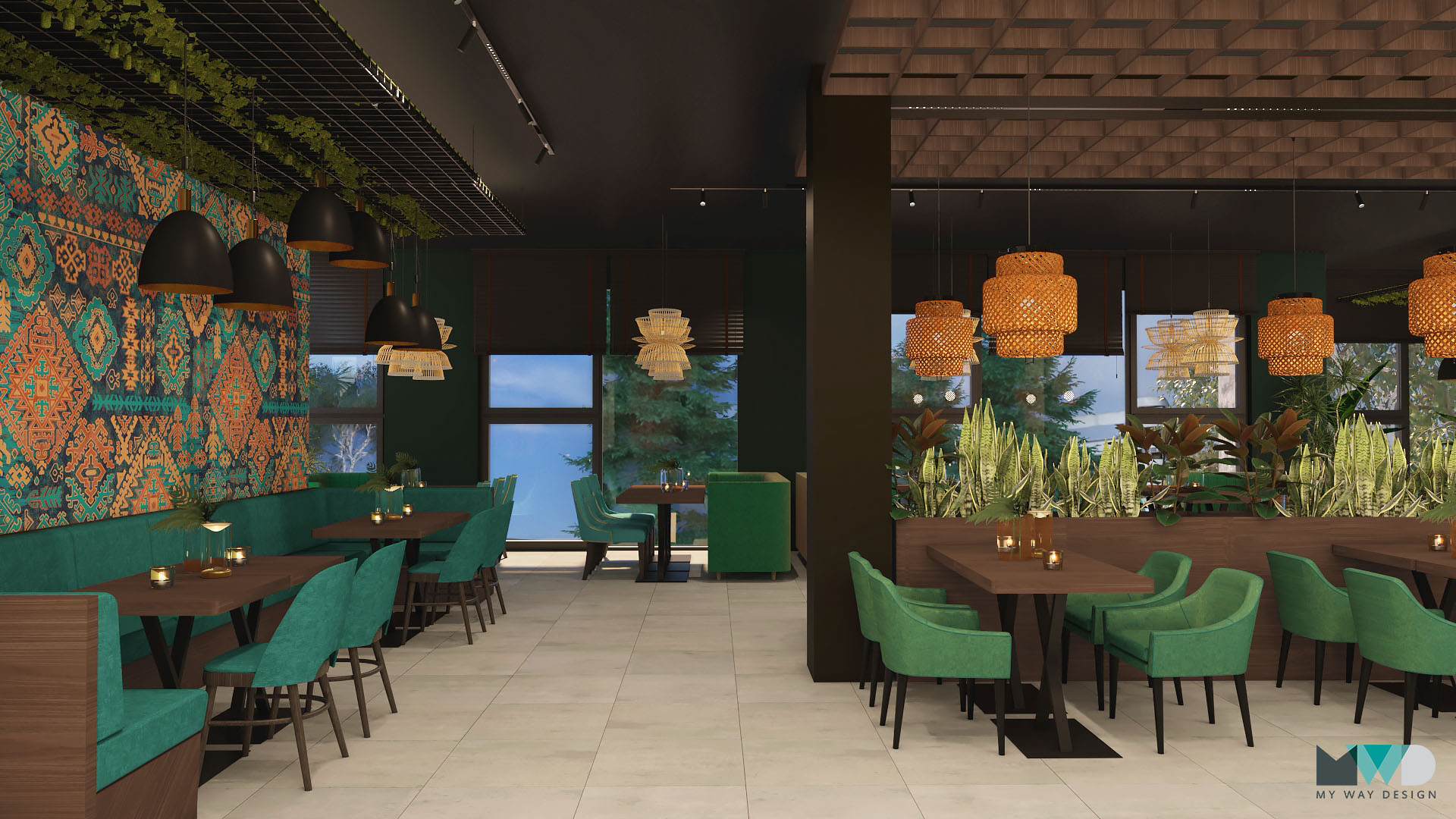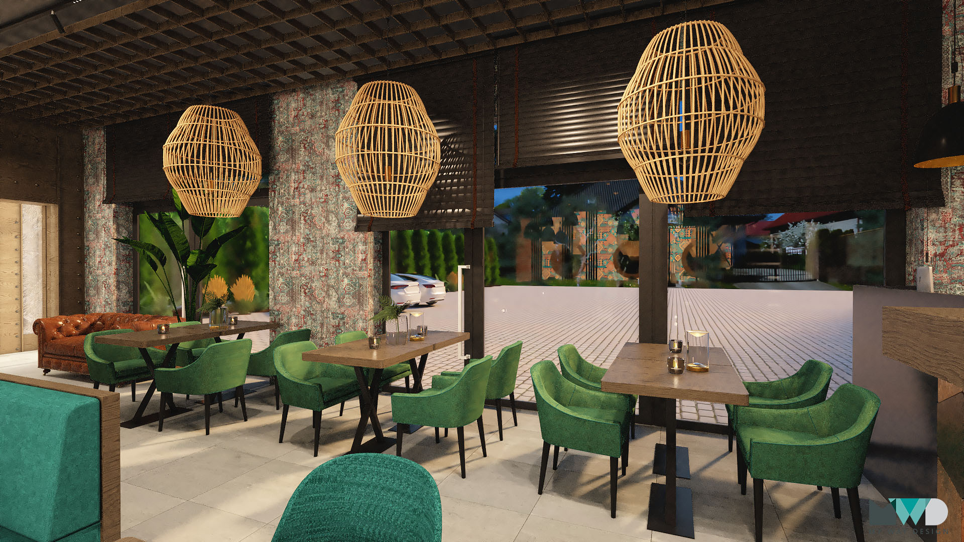 Wnętrze restauracji to prawdziwa gratka dla miłośników orientu. Ściany zdobią fototapety z orientalnymi wzorami, które przenoszą gości w klimat bliskowschodnich bazarów. Metalowe lampy, wiszące nad stołami, dodają wnętrzu klimatu, przypominając tureckie kawiarnie. Zieleń odgrywa tu kluczową rolę – liczne rośliny, starannie wkomponowane w drewniane osłony, ożywiają przestrzeń i wprowadzają atmosferę relaksu.
