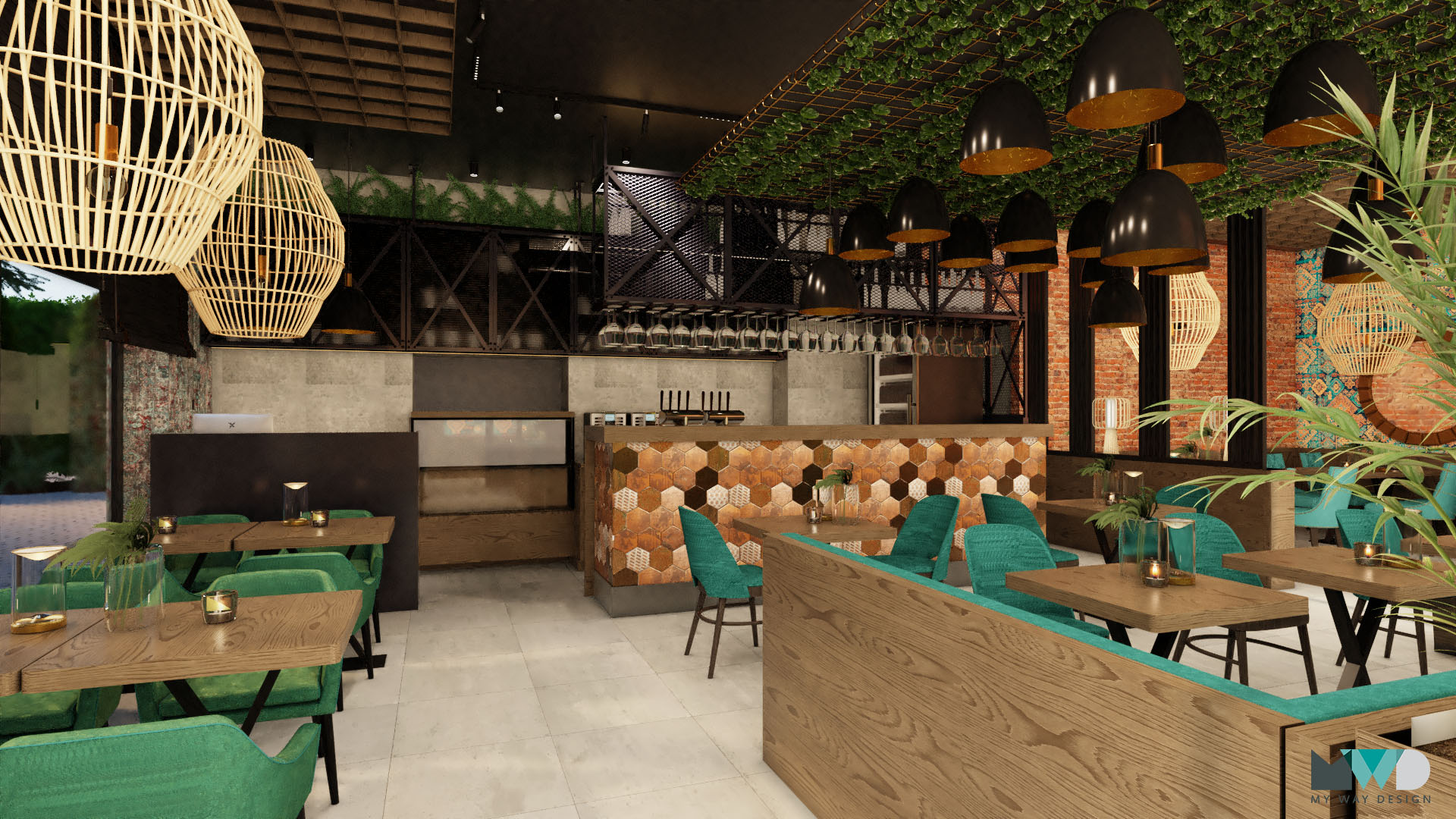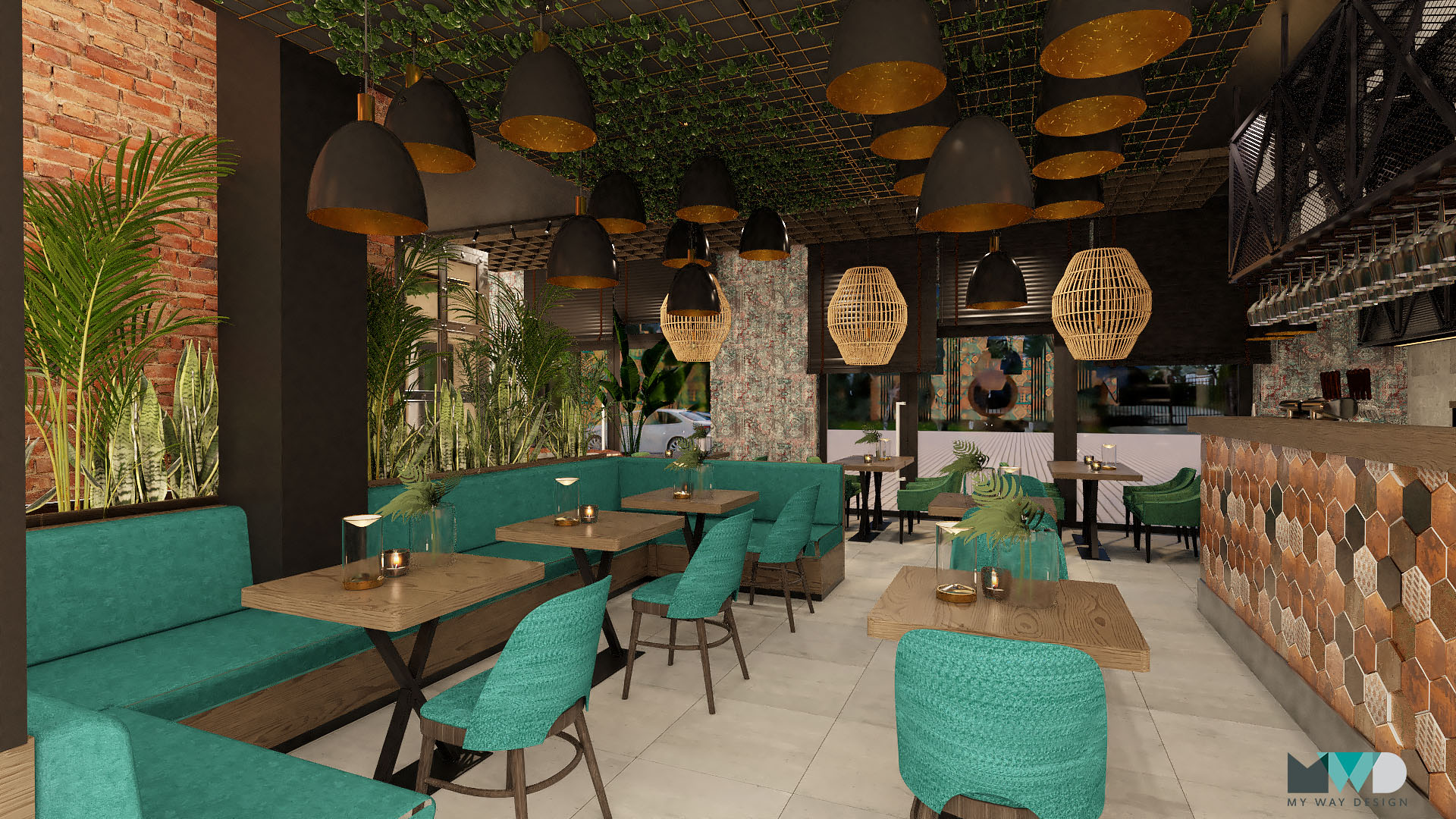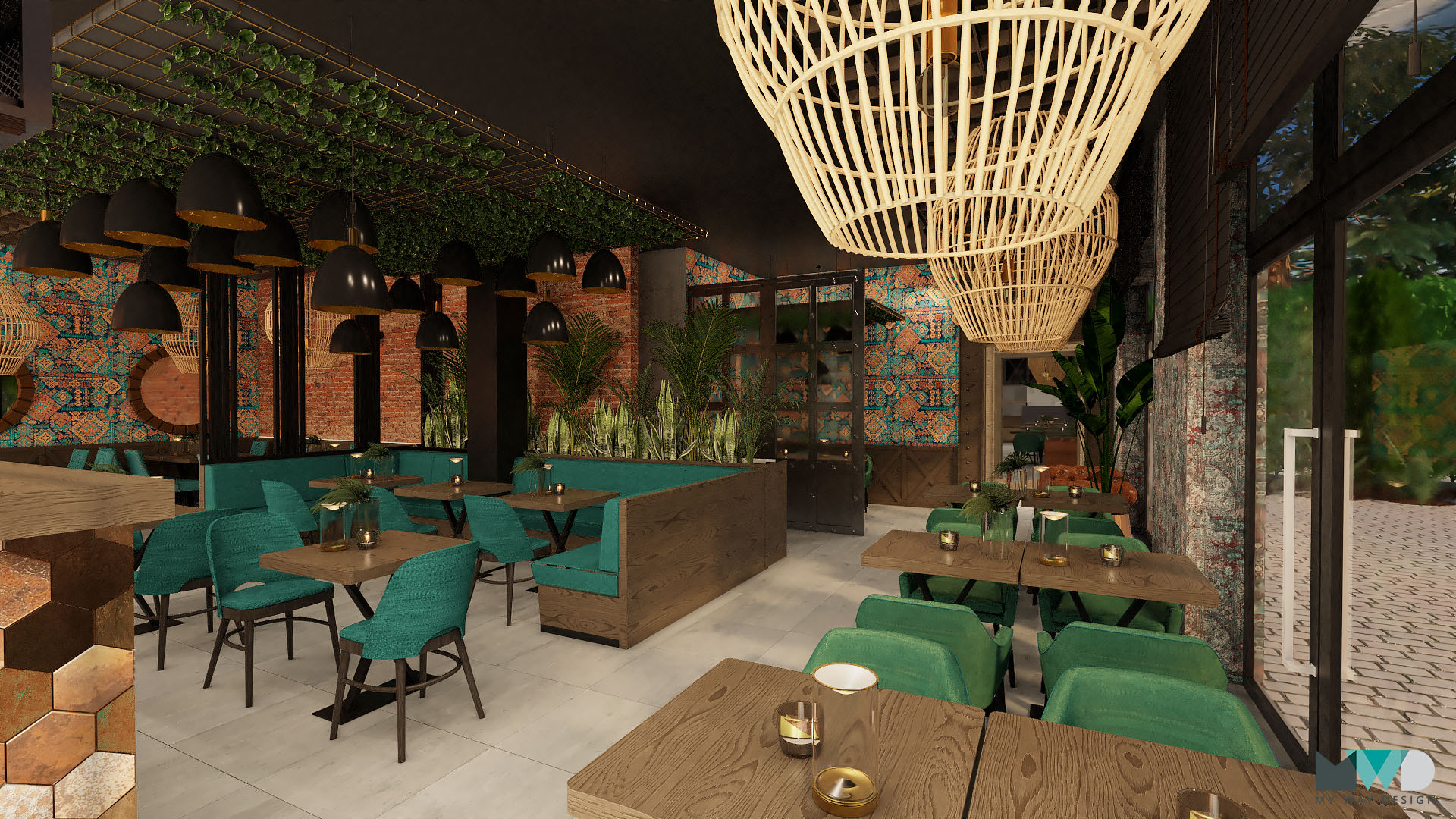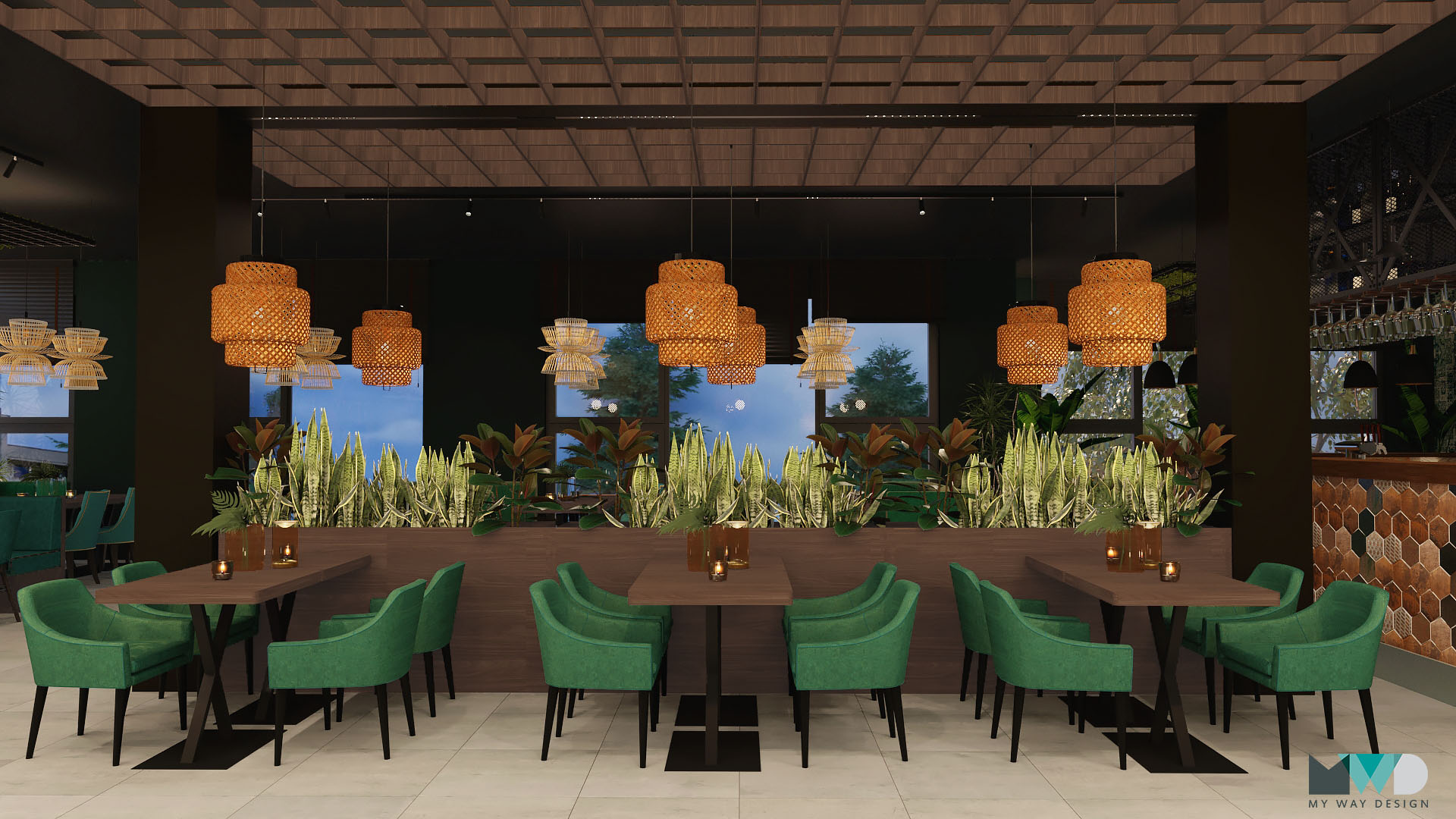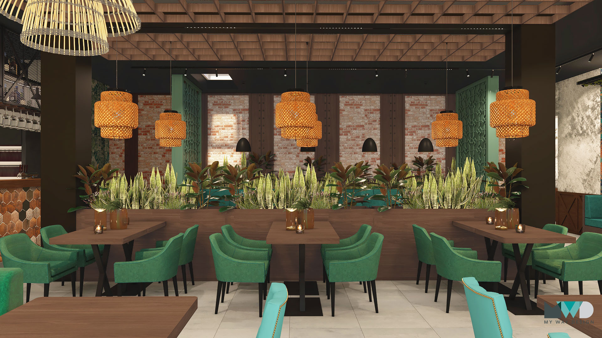 Wnętrze restauracji to prawdziwa gratka dla miłośników orientu. Ściany zdobią fototapety z orientalnymi wzorami, które przenoszą gości w klimat bliskowschodnich bazarów. Metalowe lampy, wiszące nad stołami, dodają wnętrzu klimatu, przypominając tureckie kawiarnie. Zieleń odgrywa tu kluczową rolę – liczne rośliny, starannie wkomponowane w drewniane osłony, ożywiają przestrzeń i wprowadzają atmosferę relaksu.