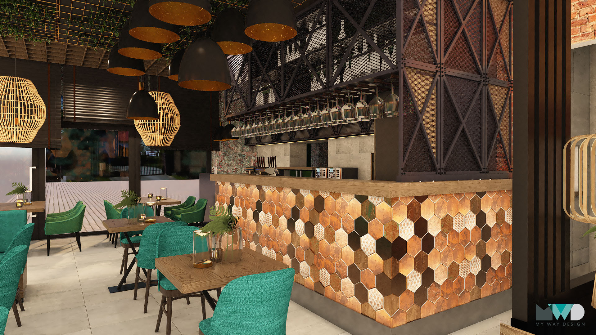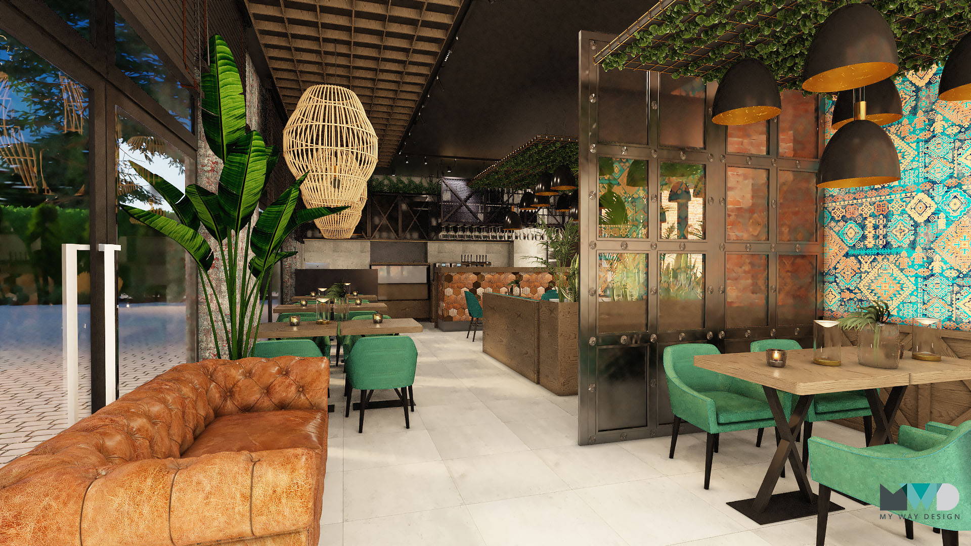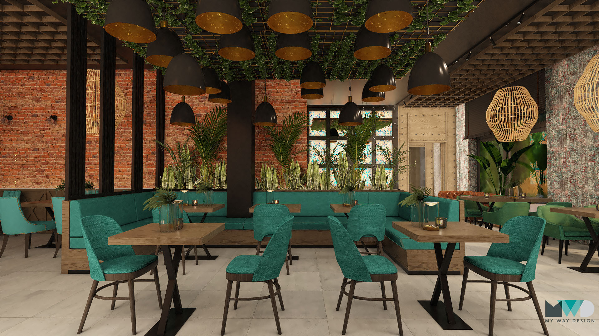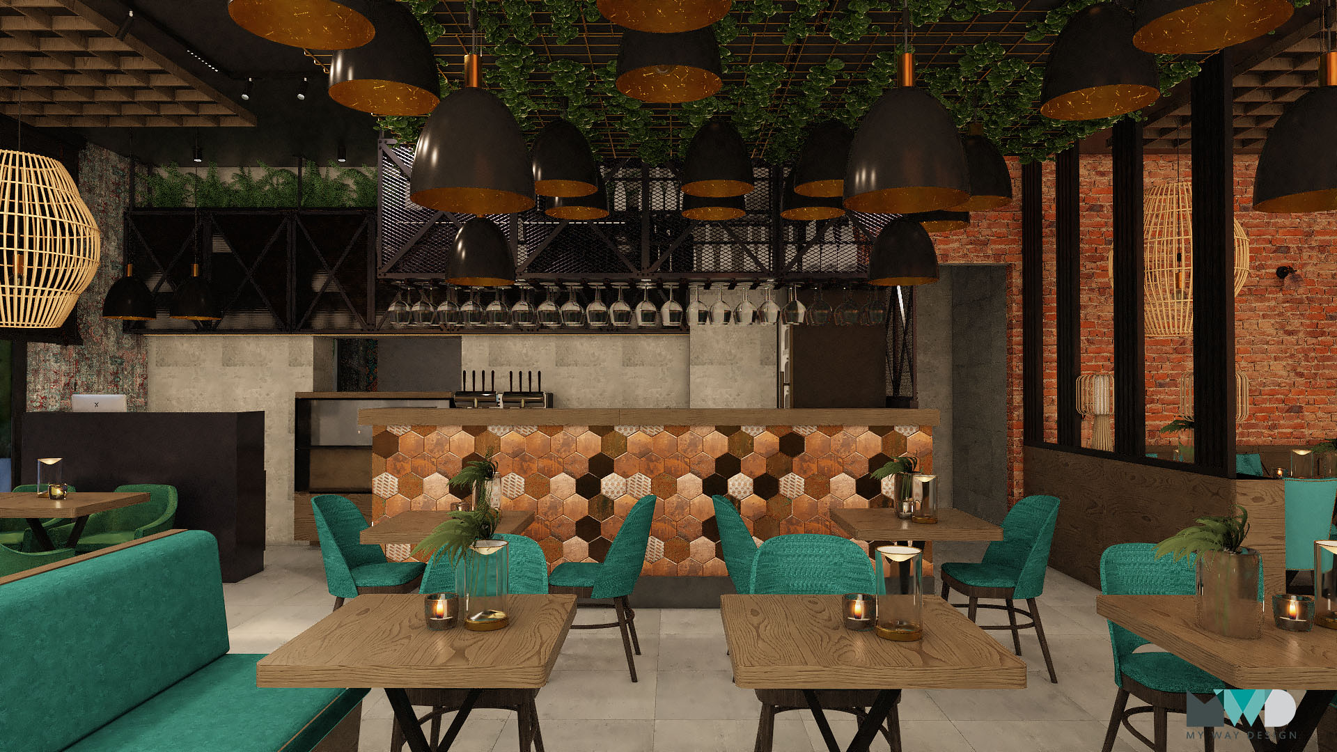 Wnętrze restauracji to prawdziwa gratka dla miłośników orientu. Ściany zdobią fototapety z orientalnymi wzorami, które przenoszą gości w klimat bliskowschodnich bazarów. Metalowe lampy, wiszące nad stołami, dodają wnętrzu klimatu, przypominając tureckie kawiarnie. Zieleń odgrywa tu kluczową rolę – liczne rośliny, starannie wkomponowane w drewniane osłony, ożywiają przestrzeń i wprowadzają atmosferę relaksu.