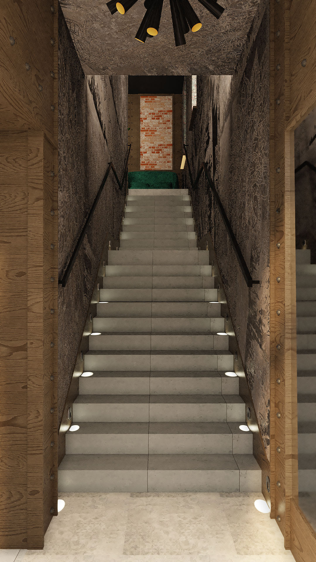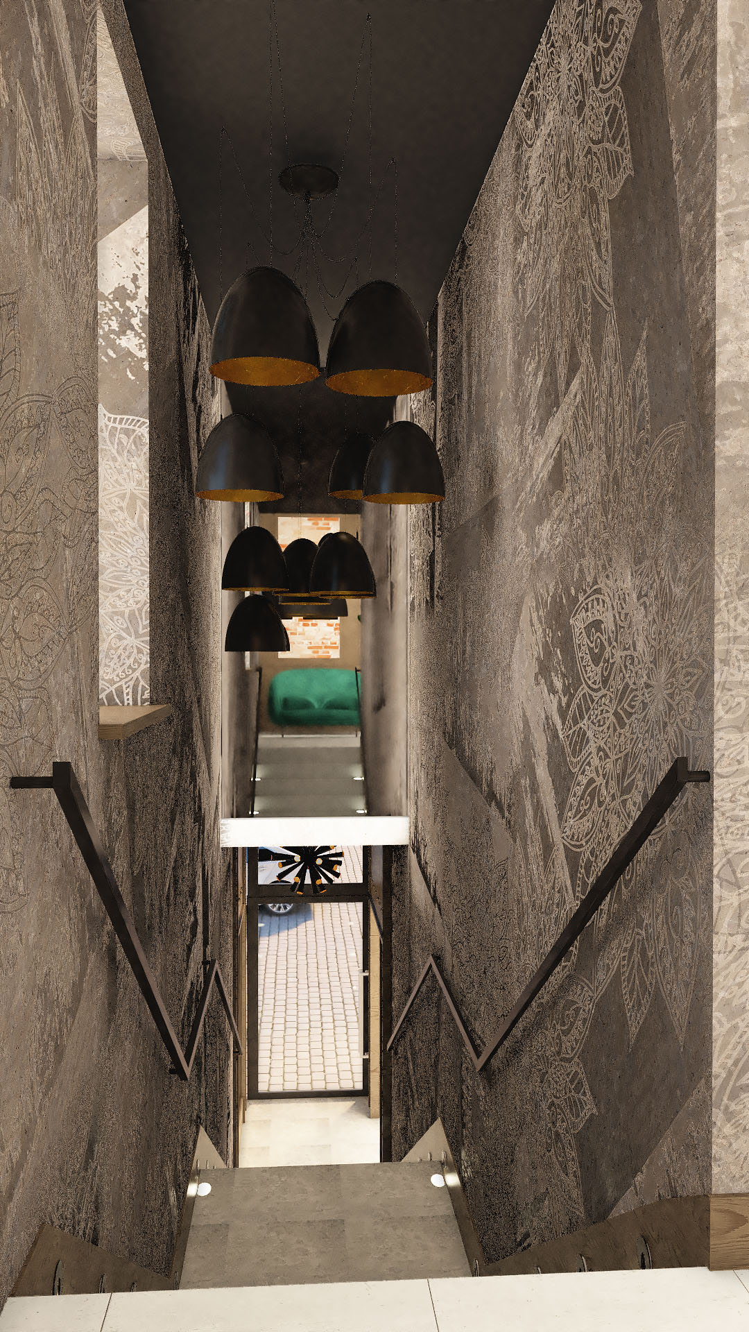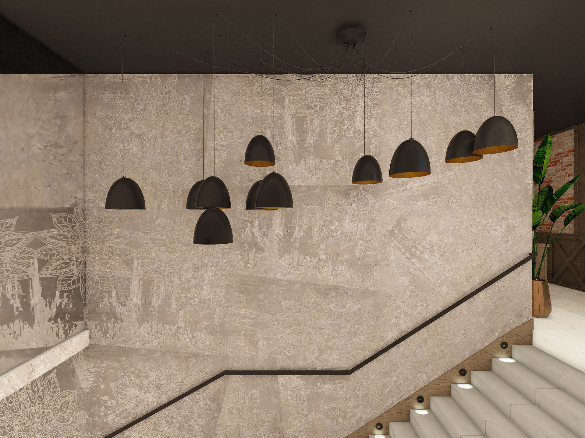 Szczególną uwagę zwraca klatka schodowa, gdzie firma Larino stworzyła unikalny tynk betonowy, ozdobiony motywem orientalnej mandali. To dzieło sztuki nie tylko podkreśla charakter wnętrza, ale także wprowadza do niego element nowoczesnego designu w perfekcyjnej harmonii z orientalnym wzornictwem.
